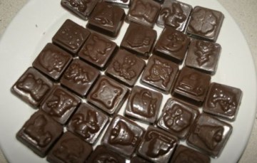 Ezeket a csoki maradékokat összegyűjtjük, s megolvasztjuk. Egy lábasban vizet forralunk, majd ráhelyezünk egy kisebb fém edényt úgy, hogy a forró víz gőze melegen tudja tartani. Ebbe belehalmozzuk a csoki darabkákat, teszünk bele vajat (nem margarint), s kis tejet. Amikor már folyékony állapotában van, akkor ezekbe a műanyag öntőformákba beleszedjük kanállal. Az öntőformából jobban ki lehet fordítani, ha icipici olvasztott vajat belecsöppentünk.