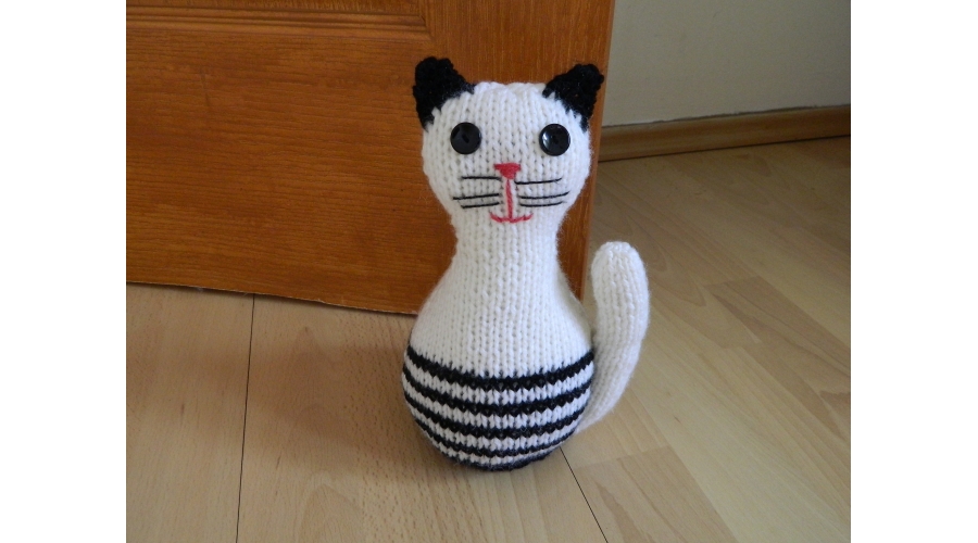 100 % kézmûves termék. A cica talpa horgolt, a teste kötött, mely tömõvattával van megtöltve. A pocakjába 500 g apró kavics került, így elég nehéz egy ajtó kitámasztásához.