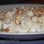 Hozzávalók: 50 dkg krumpli 2 közepes alma 1 nagyobb fej vöröshagyma 30 dkg kockázott bacon 1 evőkanál olaj ízlés szerint só őrölt szerecsendió őrölt gyömbér Elkészítése: A krumplit megtisztítjuk, hámozzuk, kockára vágjuk. Az almát megmosva héjastól, magházát kivágva, kockára vágjuk, a vöröshagymát karikára szeleteljük. Egy hőálló tálat vagy tepsit olajjal kikenünk, beleszórjuk a krumplit, hagymát, […]