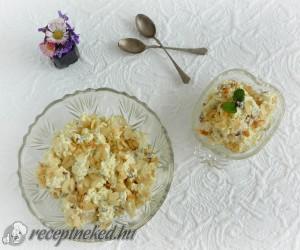 Hozzávalók: 1 csomag rizs (előfőzött ) 2 dl tejföl 2-3 ek majonéz 1 tk mustár 1 doboz ananász mazsola csipet só pici édesítőszer 1 mk kurkuma őrölt fehér bors Elkészítése: A rizst a dobozon lévő leírás szerint főzzük meg, majd hideg vízzel alaposan öblítsük le, és csepegtessük le. A darabolt ananászkonzervet öntsük bele egy szűrűbe, […]
