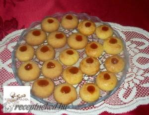 Hozzávalók: 25 dkg finomliszt 14 dkg margarin 10 dkg porcukor 1 csomag vaníliás cukor 2 tojássárgája A hempergetéshez: 2 ek kristálycukor A kókuszoshoz: 3 ek kókuszreszelék A sütemény lekenéséhez: 1 tojásfehérje A lyukakba: 2 ek baracklekvár Elkészítése: A tojásokat kettéválasztjuk. A tojássárgákat a cukrokkal és a margarinnal habosra keverjük, majd a liszttel összegyúrjuk. A tésztát […]