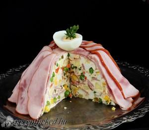 Hozzávalók: Egy kisebb kuglóf (v. őzgerinc) formához: 50 dkg vékonyra szeletelt sonka 1 nagy alma 3 csemege uborka 45 dkg franciasaláta zöldségkeverék 4 főtt tojás Zselatinos tartármártás: 1,5 dl majonéz 2 dl tejföl (20%-os) 2 dkg zselatin (por) 1 dl víz 0,5 citrom leve só őrölt bors cukor Elkészítése: A kuglóf (v. őzgerinc) formát béleljük […]