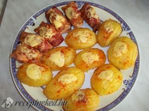 Hozzávalók: kb. 30 dkg csirkemell vékonyra szeletelve 10 dkg vékonyra szeletelt bacon (sonka, tarja is lehet) mustár ízlés szerint só bors pirospaprika kb. 5 dkg vaj 5 közepes krumpli kevés reszelt sajt a tetejére Elkészítése: A csirkemellet vékony, tenyérnyi szeletekre vágjuk, sózzuk, borsozzuk. A bacont félbe vágjuk kettőt egymás mellé a tenyerünkbe teszünk, ráfektetjük a […]