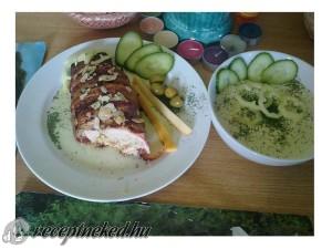Hozzávalók: A tekercshez: 30 dkg csirkemellfilé kb. 15 szelet bacon 15 dkg kemény füstölt sajt 1 kis darab póréhagyma, vagy 1 szál újhagyma A mártáshoz: 1 doboz natúr joghurt 0,5 l főzőtejszín 1 tömlős sajt (bármilyen lágy sajt) 1 kisebb vöröshagyma 1 gerezd fokhagyma só bors (legjobb a fehér) szárított, vagy friss bazsalikom Elkészítése: A […]