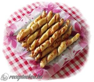 Hozzávalók: 1 csomag leveles tészta 10-12 db bacon 15 dkg füstölt sajt 1 tojás Elkészítése: A sütőt előmelegítjük 200 fokra. A leveles tésztát lisztezett deszkára rakjuk, és akkorára kell kinyújtani, amilyen hosszú a baconszelet. Felverjük a tojást, és lekenjük vele. A sajtot lereszeljük, és (egy kevés kivételével) a tésztára egyenletesen elosztjuk. A bacon szeleteket ráfektetjük […]