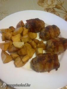 Hozzávalók: 2 csomag bacon 50 dkg darálthús 10-15 dkg reszelt sajt 2 tojás 2 zsemle 1 fej hagyma 1 kiskanál ételízesítő zsemlemorzsa Elkészítése: A zsemlét tejben áztatjuk, a hagymát kevés olajon megpirítjuk. A hússal jól összedolgozzuk a kicsavart zsemléket, a hagymát, a reszelt sajtot, a felvert tojásokat és az ételízesítőt. A masszából egyforma nagyságú golyókat […]