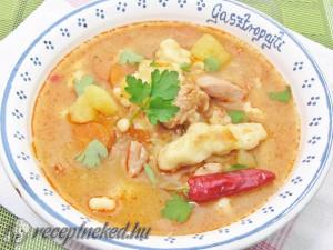 Hozzávalók: 1 kg pulyka felső comb filé 5 sárgarépa 2 petrezselyem gyökér 1,5 ek zsír 2 kisebb hagyma apróra vágva 3 gerezd fokhagyma szétnyomva 1 csokor petrezselyemzöld 1 levél zellerzöld 1 lestyánlevél 1 zöldpaprika karikára vágva 2 közepes paradicsom meghámozva kevés köménymag 0,5 kg krumpli kockázva só frissen őrölt bors Galuskához: liszt 2 tojás víz […]