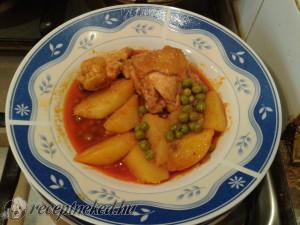 Hozzávalók: 1 db kisebb csirke (90 dkg) 50 dkg zöldborsó 1 kg újkrumpli 1 fej vöröshagyma 1 hegyes erős paprika 1 paradicsom 0,5 tv paprika só 1 ek pirospaprika 1 ek olívaolaj Elkészítése: Az olajat feltesszük melegedni, rádobjuk a kockára vágott hagymát, megdinszteljük, rárakjuk az összedarabolt csirkét, megsózzuk, fehéredésig dinszteljük, majd rászórjuk a pirospaprikát, felengedjük […]