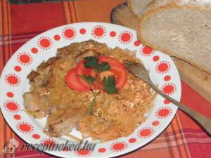 Hozzávalók: 2 kg savanyú káposzta 4 evőkanál (kacsa)zsír 2 fej vöröshagyma 1,5 kg sertéstarja 4 dl tejföl 3 dl paradicsomlé (házi) 2 csokor kapor 1 teáskanál csombor (borsikafű) őrölt bors só Elkészítése: A római tálat beáztatjuk. A húst kicsontozzuk, majd felszeleteljük. A nagyobb darabokat félbevágjuk. A hagymát apróra vágjuk és zsíron megdinszteljük. A hússzeleteket hirtelen […]