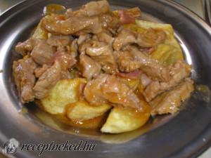 Hozzávalók: 60 dkg sertés szűz 1 fej vöröshagyma 1 gerezd fokhagyma 10 dkg kolozsvári szalonna só bors 1 kg burgonya hasábokra vágva 1 ek zsír kb 1,5 dl leves alaplé Elkészítése: A szalonnát csíkokra vágjuk és kisütjük egy serpenyőben, majd a pörcöt kiszedjük. A visszamaradt zsiradékhoz hozzáadjuk a zsírt, majd az apróra vágott hagymát megpirítjuk, […]