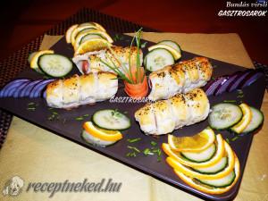 Hozzávalók: 1 db fagyasztott leveles vajas tészta 0,5 kg virsli 1 db tojás a kenéshez petrezselyem a szóráshoz Elkészítése: A tésztát felengedjük, kinyújtjuk. Vékony csíkokra szeleteljük. A virslit vagy egészben hagyjuk, vagy ketté vágjuk. Beletekerjük a tésztába. Sorba rakjuk egy tepsibe, megkenjük felvert tojással, megszórjuk petrezselyemmel. 200 fokos sütőbe tesszük, kb fél óra alatt megsütjük. […]