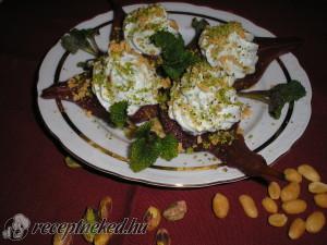 Hozzávalók: 4 db-hoz: 2 közepes alexander körte 3 dl száraz vörösbor 1 ek kristálycukor 1/2 kisujjnyi fahéj 2 szem szegfűbors 20 g héjas pisztácia 20 g tisztított mogyoró 100 g érett rokfort (márványsajt) 100 g natúr vajkrém só bors néhány citromfűlevél Elkészítése: Érett, de kemény körtéket vásároljunk, mossuk meg, hámozzuk meg, és száruk épségére ügyelve […]