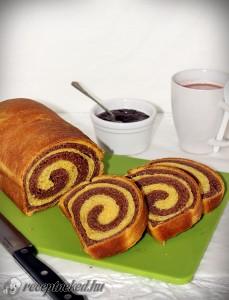 Hozzávalók: Hozzávalók a sütőtökös tésztához: 15 dkg liszt 2,5 dkg rétes liszt 0,7 dkg élesztő 0,5 dl tej 1 ek cukor nagy csipet só 1,5 dkg margarin 1 tojássárgája (kicsi) 8 dkg sütőtök (előzőleg megsütve) Hozzávalók a kakaós tésztához: 12,5 dkg liszt 2,5 dkg rétes liszt 0,7 dkg élesztő 0,5 dl tej 1 ek cukor […]
