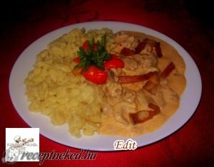 Hozzávalók: 1 kg sertéslapocka 20 dkg füstölt szalonna 2 fej vöröshagyma 2 paradicsom 2 gerezd fokhagyma 2 db fehérpaprika 2 dl tejföl 1 ek liszt 2 kávéskanál pirosporpaprika só őrölt fekete bors ízlés szerint Elkészítése: A csíkokra vágott szalonnát megpirítjuk, majd kiszedjük a zsiradékból. Ebben megfonnyasztjuk az apróra vágott vöröshagymát, majd a felcsíkozott húst. Pirospaprikát […]