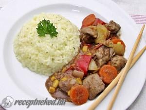 Hozzávalók: 1 kg csirkemáj 3 szál sárgarépa 3 db kápia paprika 5 db paradicsom 3 fej hagyma 5 gerezd fokhagyma 1 doboz csemegekukorica 2 cl borecet1 kk gyömbér 1 mk koriander 2 db chilipaprika 1 ek szójaszósz 1 ek keményítő 1 ek étolaj 2 kávéskanál ételízesítő Elkészítése: A répát felszeleteljük. A hagymát feldaraboljuk, a fokhagymát […]