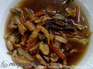 Hozzávalók: 400 gcsirkemell 1 répa (nagyobb) 1 karalábé (kisebb) 1 kelkáposzta (kisebb vagy 7-8 levél) 1 zeller (kisebb) 25 g szárított gomba 1500 m lhúsleves (csirkealaplé) szójaszósz hoisin szósz őrölt bors csípős paprikakrém (vagy Tabasco szósz) borecet 2 ek keményítő 100 m lvíz 2 ek szezámolaj Elkészítése: A csirkemellet felvágjuk vékony csíkokra, majd fél órára […]