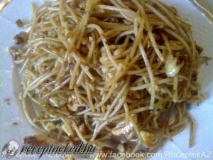 Hozzávalók: 250 g spagetti (teljes kiörlésű lisztből) 3 ek olívaolaj 3 ek szójaszósz 2 gerezd fokhagyma 30 g gyömbér 100 g dió 1⁄2 tk csilipehely 1⁄2 csokor petrezselyemzöld Elkészítése: A spagetti tésztát kifőzzük, leszűrjük. Száraz wokban megpirítjuk a diót, majd durvára törjük és félretesszük. A wokban felhevítjük az olívaolajat, beletesszük a reszelt fokhagymát és a […]