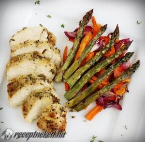 Hozzávalók: Csirkemell hozzávalói. 1 db csirkemell filé (ketté vágva) 2 gerezd fokhagyma 2 tk dijoni mustár 3 ek olívaolaj 1 tk worchester szósz 1 tk szójaszósz só színes bors kakukkfű szerecsendió Hozzávalók a sült zöldséghez: 1 cs zöld spárga 2 db sárgarépa 2 db lila hagyma 1/2 citrom leve só őrölt színes bors 2 ek […]