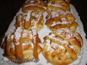Hozzávalók: 50 dkg liszt csipet só 1 tasak instant élesztő 3 tojássárgája 4 ek cukor langyos tej (amennyit felvesz) 5 dkg olvasztott vaj 4 alma 1 citrom őrölt fahéj 2 ek kristálycukor 1 tojás a kenéshez Tetejére: fahéjas porcukor Elkészítése: A hozzávalókból könnyen gyúrható tésztát készítek. Ezután olvasztott vajjal meglocsolom, és konyharuhával letakarva langyos helyen […]