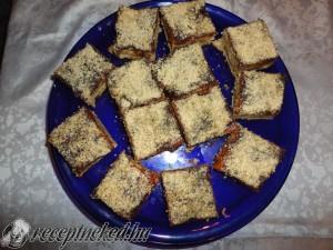 Hozzávalók: Tésztához: 30 dkg átszitált finomliszt 20 dkg porcukor 20 dkg margarin 3 db egész tojás 1 csapott kávéskanál szódabikarbóna csipet só 6 közepes méretű alma 4 evőkanál kristálycukor Tetejére: 6 evőkanál baracklekvár 20 dkg margarin 3 púpozott evőkanál instant kakaó Szóráshoz: 5 dkg darált dió Elkészítése: Az almát meghámozzuk, csumáját eltávolítva kis kockákra vágjuk, […]