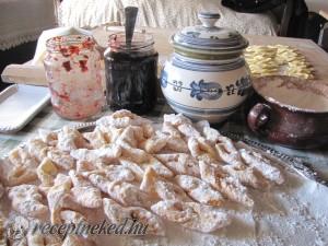 Hozzávalók: 35 dkg liszt 3 db tojás 1 sütőpor 3 kanál tejföl 1 mokkáskanál só barack- vagy málnalekvár porcukor (tetejét megszórni) olaj vagy zsír (a sütéshez) Elkészítése: A lisztből a sütőporral és a tojásokkal valamint a tejföllel tésztát gyúrunk, és kb. fél centi vastagságúra kinyújtjuk. Derelyevágóval vagy késsel rombuszformákat vágunk, közepüket behasítjuk. Ezen a lyukon […]