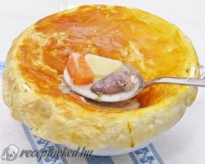 Hozzávalók: 200 g főzőtejszín 30 dkg csirkeszív 2 sárgarépa tisztítva és karikákra vágva 1 petrezselyemgyökér tisztítva és karikákra vágva 5 krumpli kockára vágva 1 csokor újhagyma karikákra vágva 1 kávéskanál kapor finomra aprítva 250 g leveles tészta 1 tojás a tészta kenéséhez ízlés szerint só és bors 1 dl fehérbor 1 kisebb méretű kakukkfű ágacska […]