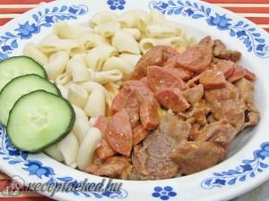 Hozzávalók: 80 dkg sertés lapocka 20 dkg debreceni páros kolbász 2 fej hagyma 3 gerezd fokhagyma 1 zöldpaprika 1 nagyobb paradicsom só őrölt bors őrölt pirospaprika 1 dl száraz fehérbor 1 ek zsír Elkészítése: A húst csíkokra vágjuk, a hagymát apróra daraboljuk. Zsíron megpirítjuk a hagymát, majd hozzáadva a felcsíkozott húst, addig pirítjuk, míg fehéredni […]