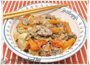 Hozzávalók: 1 kg csirkemáj 2 nagy fej hagyma, nagyobb kockákra vágva 5 gerezd fokhagyma, kés lapjával szétnyomva 4 db sárgarépa, hasábra vágva 1/4 kisebb káposzta, a torzsa felőli vastagabb levelek felkockázva 2 db nagy paradicsom meghámozva (forró vízbe mártva, majd a héja lehúzva) 4 db lecsópaprika nagyobb darabokra vágva 5 db csiperkegomba felszeletelve 1 hüvelykujjnyi […]