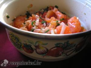 Hozzávalók: 1 mogyoróhagyma 1 gerezd fokhagyma 4 evőkanál olívaolaj só bors 5 közepes méretű paradicsom egy ek citromlé 1 marék frissen aprított turbolya turbolya hiányában metélőhagyma Elkészítése: Vágjuk a mogyoróhagymát és a fokhagymát olyan finomra, amennyire csak emberileg lehetséges – robotgéppel teljesen péppé is dolgozhatjuk –, majd tegyük egy kisebb tálba, öntsük rá az olajat, […]