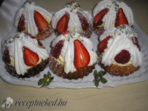 Hozzávalók: 0,5 kg eper 6 db tojás 12 dkg liszt 6 dkg étkezési keményítő 1 tasak vaníliás cukor 1 l tejszín 1 kk sütőpor 18 dkg kristálycukor 10 dkg lapka mandula (meg kell pirítani, száraz teflon serpenyőben) 3 ek porcukor (a tejszín ízesítéséhez) Elkészítése: A tojásokból, a cukorból, a lisztből, a sütőporból, az étkezési keményítőből […]