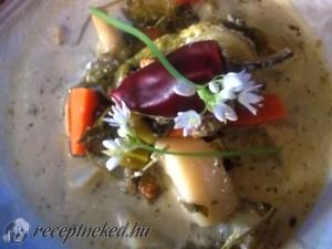 Hozzávalók: 1 l füstölt csülök főzőlé 2 dl kolbász főzőlé 1 sárgarépa 1 petrezselyem-gyökér 0,5 karalábé 3 szál zsenge karalábélevél 1 kis zeller 3 szál zellerlevél 1 újhagyma zöldjével 0,5 póréhagyma 0,5 csokor medvehagyma 0,5 csokor petrezselyem 1 kicsi fejessaláta 3 nagy burgonya 1 ek friss tárkonylevél 1 csokor kapor 2 chili só őrölt fekete […]