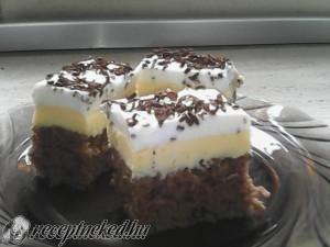 Hozzávalók: A tésztához: 6 tojás 6 dkg porcukor 6 dkg liszt 3 ek kakaó 5 dkg étcsoki 5 dkg darált dió 2 ek víz 1 csomag sütőpor A krémhez: 20 dkg porcukor 25 dkg margarin 2 dl tej 1 csomag vanília ízű pudingpor A tetejére: 2 dl habtejszínt csokireszelék Elkészítése: A tojások fehérjéből kemény habot […]