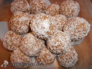 Hozzávalók: 500 g darált keksz 2 evőkanál porcukor 2 evőkanál fahéj 15 dkg margarin 2-3 dl tej 2 kk rumaroma kókuszreszelék Elkészítése: Egy tálban a darált kekszet és a hozzávalókat az olvasztott margarinnal összegyúrom és a felforralt tejet fokozatosan öntöm hozzá. Amikor jól formálható lesz, gombócokat formázok belőle és meghempergetem a kókuszreszelékben.