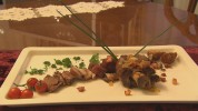 Saját készítésű mangalica szalámi és sonka, hétfogás egy tányéron, lecsós galuska, házi eperfagylalt, amás pite, aranygaluska vaníliamártással.