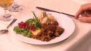 Sültpaprika-krémleves, T-bone steak tejszínes rákraguval, újragondolt mákos guba.