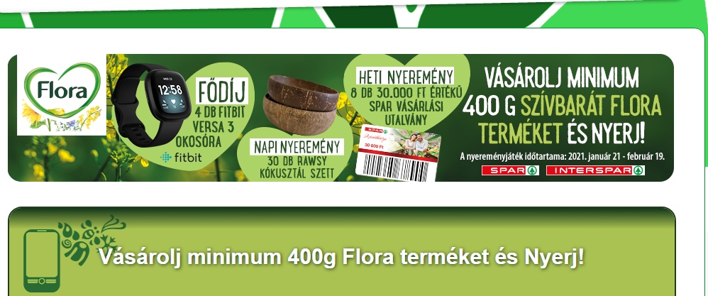 Vásárolj a SPAR Magyarország Kereskedelmi Kft., a SPAR partnerek magyarországi üzleteiben, vagy az áruház online webshopján keresztül, egy alkalommal minimum 400 grammnak megfelelő Flora* terméket 2021. január 21. és 2021. február 19. között és a tied lehet a következő nyeremények egyike.