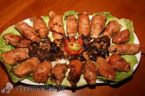 Hozzávalók: 1 kg csirkemell szeletelve 30 dkg aszalt szilva 1 nagy fej fokhagyma 20 dkg csíkozott bacon szalonna Elkészítése: A húst vékony féltenyérnyi szeletekre vágom és mindkét oldalát sózom-borsozom ízlés szerint. Minden kimagozott aszalt szilvába dugok egy gerezd fokhagymát. A húsra egy bacon csíkot teszek arra egy fokhagymás szilvát és feltekerem. A húsgöngyölegeket egymás mellé teszem […]