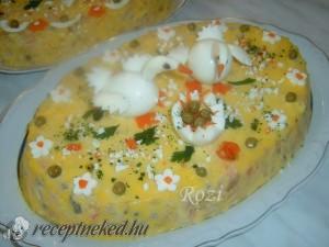 Hozzávalók: 25 dkg levesben főtt sovány marhahús (lehet disznó, vagy szárnyas is) 3-4 főtt sárgarépa 2 petrezselyem 1-1 tojás nagyságú főtt zeller és főtt karalábé 4-5 héjában főtt burgonya 1-2 kemény tojás 3 ecetes uborka 1 pohárnyi főtt zöldborsó 3 tojásból majonéz 1 dl tejföl só bors mustár fél citrom leve Majonéz: 1 kemény és […]