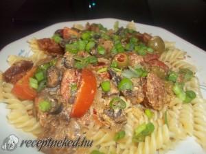 Hozzávalók: 25 dkg fusilli 25 dkg csiperkegomba 1 vöröshagyma 3 gerezd fokhagyma 3 szál újhagyma zöldjével 1 csípős hegyes paprika 2 chili paprika 2 paradicsom 1 ek fekete olívavogyó 1 ek chilivel töltött zöld olívabogyó 1 ek ketchup 1 ek chiliszósz só őrölt fekete bors őrölt csípős piros paprika kakukkfű oregán olívaolaj 15 dkg lángolt […]
