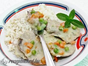 Hozzávalók: 1 kg sertéstarja kevés só, és bors 1 kanál mustár 250 g vegyes fagyasztott zöldség kevés kapor, finomra aprítva kevés majoránna kevés fokhagyma granulátum 1 kanál vaj 200 g főzőtejszín 1 kanál liszt Elkészítése: A kicsontozott tarját bedörzsöljük sóval, őrölt borssal, mustárral, majd fóliával borítva a sütőbe tesszük 200 fokon. A fagyasztott zöldségkeveréket sós […]