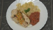 Tonhal krém / Mozzarellás julienne zöldségekkel töltött csirkemell pesto rossóval és parmezános farfellével / Mákos guba