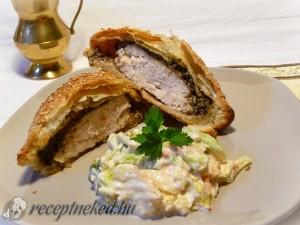 Hozzávalók: 2 fél csirkemellfilé 25 dkg gomba 1 csomag leveles tészta só őrölt bors szerecsendió 2-3 ek olívaolaj 1 tojás a lekenéshez szezámmag (elhagyható) Elkészítése: A két fél csirkemellfilét ízlés szerint sózzuk, borsozzuk, majd hagyjuk egy kicsit állni. Egy serpenyőbe öntsünk egy evőkanál olajat, majd süssük a mellek mindkét oldalát 2-3 percig. Ezután vegyük ki […]