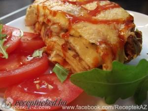 Hozzávalók: Tésztához: 350 ml tej 3 tojás 150 g liszt 1 csipet szerecsendió Töltelék: 500 g csiperke gomba 2 vöröshagyma 100 g szeletelt sonka 100 g tömlős sajt 200 g tejföl só őrölt bors kakukkfű olaj 200 g reszelt sajt Elkészítése: A tésztához a hozzávalókat összekeverjük. Pihenni hagyjuk 15 percet. A tésztából 8 db palacsintát […]