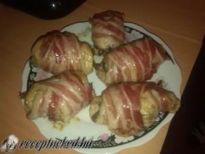 Hozzávalók: 6 csirkecomb 1 üveg gomba 1 fej vöröshagyma 10 dkg füstölt tarja friss petrezselyemzöld 6 szelet bacon sült csirke fűszerkeverék só bors Elkészítése: A csirkecombokat kicsontozzuk, de a bőrét rajta hagyjuk. Befűszerezzük a fűszerkeverékkel. A hagymát apróra vágjuk és kevés olajon megdinszteljük. Hozzáadjuk a kis kockára vágott füstölt tarját, majd a gombát. Összesütjük, sózzuk, […]