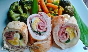 Hozzávalók: 4 csirkemellfilé 4 tojás 1 csokor medvehagyma 20 dkg trappista sajt 20 dkg füstölt sonka só őrölt fehér bors 8 szelet bacon 2 ek ecetes torma 1 tk szárnyas fűszerkeverék Elkészítése: A tojásokat megfőzzük, karikákra vágjuk. A csirkemelleket szétnyitjuk, kiklopfoljuk, sózzuk, és megkenjük ecetes tormával. A sajtot és a füstölt sonkát szeletekre vágjuk. Mindegyik […]