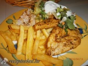 Hozzávalók: 60 dkg csirkemell gyros fűszerkeverék napraforgó étolaj 1 kg krumpli 250 g rizs 1 cs salátakeverék 400 g natúr joghurt 1 cs kapros-joghurtos salátaöntet Elkészítése: A megmosott csirkemellet szeletekre vágom és minden oldalát bedörzsölöm gyros fűszerkeverékkel, majd pici olajjal és állni hagyom. A rizst sós vízben megfőzöm, a krumplit olajba kisütöm. A natúr joghurtot […]