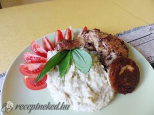 Hozzávalók: 6 főre 6 egész csirkecomb kettévágva 1 csomag grillcsirke fűszer 5-6 gerezd fokhagyma reszelve 2-3 ek kakukkfű 1 ek mustár Almás zellerpüré: 1 nagyobb zsenge zellergumó 2 nagy alma 1 vöröshagyma 5-6 gerezd fokhagyma 15-20 zsenge medvehagyma levélke frissen őrölt színes bors 2 ek vaj 2 dl tejszín só 1 ek citromlé olaj Elkészítése: […]