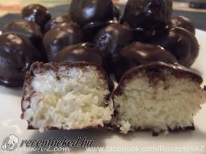 Hozzávalók: 150 g édesített sűrített tej 100 g kókuszreszelék 100 g csokoládémáz Elkészítése: Az édesített sűrített tejet összekeverjük a kókuszreszelékkel és hideg helyen pár órát állni hagyjuk. Vizes kézzel golyókat formázunk amit csokoládémázban forgatunk meg. Hagyjuk megszikkadni.