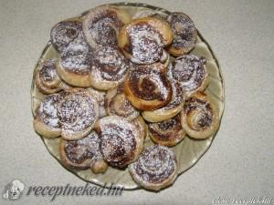 Hozzávalók: 50 dkg fagyasztott leveles tészta cukor kakaópor olaj Elkészítés: A tésztát kiolvasztjuk , fél-1 cm vastagságúra nyújtjuk. A tetejét picit megolajozzuk, megszórjuk ízlés szerint cukorral és kakaóporral (cukrozottal vagy natúrral is jó). Kicsit belenyomkodjuk kézzel a tésztába, majd felcsavarjuk. Ujjnyi szeleteket vágunk belőle, és 200 fokon kb. 10-15 perc alatt aranybarnára sütjük.