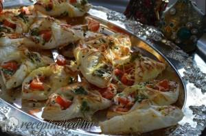 Hozzávalók: 1 csomag fagyasztott leveles tészta egy kevés liszt egy kevés zsír 2 paradicsom 2 egész tojás 1 szál újhagyma kis petrezselyem köménymag sajt Elkészítése: A leveles tésztát kinyújtjuk, majd megkenjük petrezselymes tojással. Ezután kockákra vágjuk, a hagymát és a paradicsomot felaprítjuk, majd rárakosgatjuk a tésztára. Megszórjuk sóval, köménnyel és összehajtjuk. Sajttal megszórjuk, majd előmelegített sütőben […]
